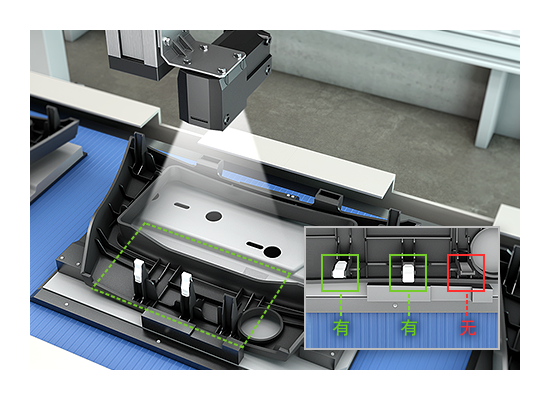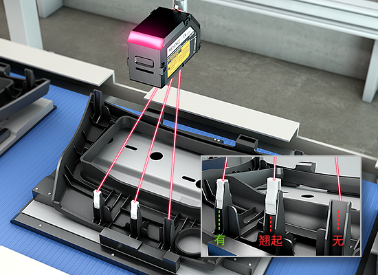 通过激光实现,对目标物多个点,同时进行高度、高度差检测,即便产品位置偏斜也不受影响。