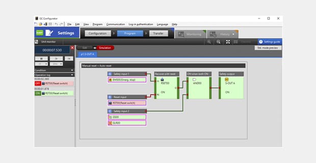 安全控制器GC 系列是一款具有超快速响应时间、实时显示状态的液晶显示器、轻松易用等特点的安全控制器。5.5 ms(有扩展单元时:9.6 ms)的响应速度帮助缩短安全距离。而且,即使程序量增加,响应时间也不会受到影响。主机上搭载的液晶显示器能够显示以往*无法看到的安全设备的状态。大幅提升了安全控制器的易用性。此外,采用了简化配线的接口,避免配线错误,并采用简易设定的软件有效减少了配置时间。备有通过扩展单元支持最大输入点数212 点的 GC-1000和内置继电器输出的 GC-1000R两种主控制器可选。* 与本公司SC 系列产品的比较