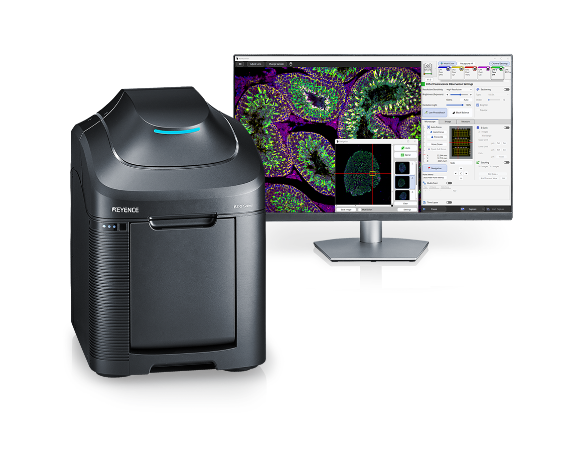 BZ-X1000 系列是一款一体化荧光显微镜,具有先进的观察功能、全电动操作系统,可实现即时目标采集、高级成像和尖端分析功能。 与传统型号相比,成像速度快5倍,分辨率高3.5倍,有助于提高研究人员的工作效率。 无需暗室,占地面积只有 A3纸大小。 配备单色/彩色可切换高灵敏度冷却CCD相机,可进行高分辨率观测。 大型电动云台可立即接近所需位置,高速自动对焦和拍摄条件再现功能可确保观察结果不受操作员的影响。 除了无荧光模糊的高分辨率成像和多孔板整个表面的自动批量成像外,还可按设定的时间间隔进行明视野、荧光和相衬的延时成像。 此外,对荧光显微镜至关重要的图像分析量化功能也实现了自动化,具有丰富的分析功能,包括三维分析、动态分析和自动时间序列量化。